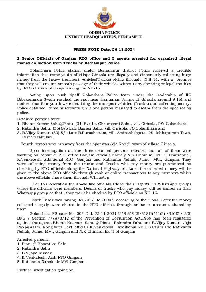 Berhampur – In a significant breakthrough, the Odisha Police exposed a widespread corruption network involving senior officials of the Ganjam Regional Transport Office (RTO) and their agents. The operation, carried out by the Golanthara Police, uncovered an organized illegal money-collection racket that targeted heavy transport vehicles (trucks) along National Highway-16.
